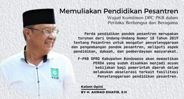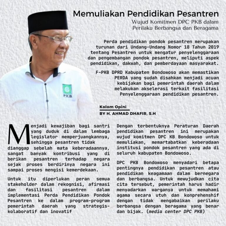Memuliakan Pendidikan Pesantren Wujud Komitmen DPC PKB dalam Perilaku Berbangsa dan Beragama BY H. AHMAD DHAFIR, S.H Perda pendidikan pondok pesantren merupakan turunan dari Undang-Undang Nomor 18 Tahun 2019 tentang Pesantren untuk mengatur penyelenggaraan dan pengembangan pondok pesantren, meliputi aspek…